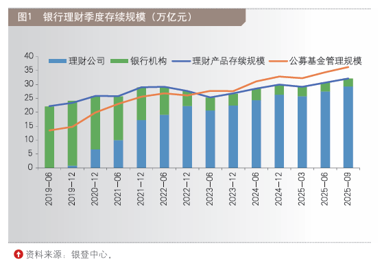 如图1所示,按银行业信贷资产登记流转中心(以下简称银登中心)口径,截至2025年9月,银行理财市场存续规模录得32.13万亿元,同比增速9.4%。进一步叠加14家规模超万亿元的理财机构自第四季度以来的合计规模增量,截至2025年12月末,银行理财市场规模接近34万亿元,持续创历史新高,同比增速或升至12%,年内累计规模增长约4万亿元。同期,公募基金存续规模或达36万亿元,同比增速11.4%,年内累计规模增长约3.6万亿元。